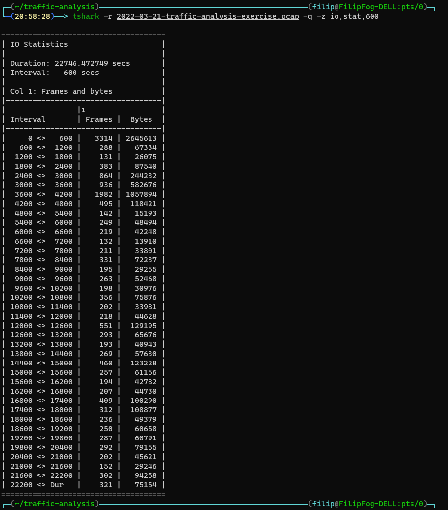 tshark -r 2022-03-21-traffic-analysis-exercise.pcap -q -z io,stat,600