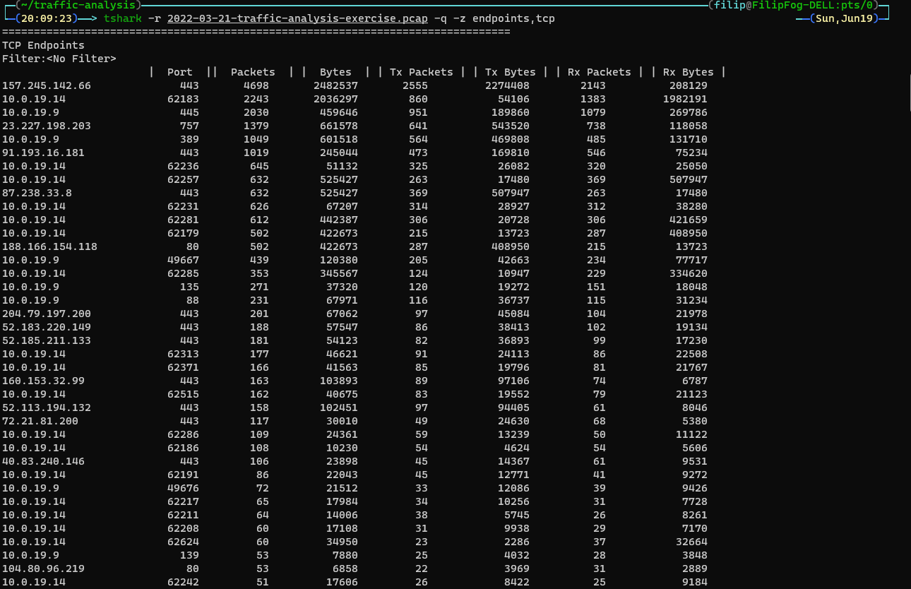 tshark -r 2022-03-21-traffic-analysis-exercise.pcap -q -z endpoints,tcp | less